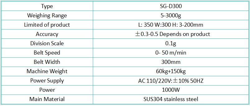 SG-D300 Multi Level Weight Sorting Machine can be used for sorting 2 to 12 grades of weight, with the weight range from 5g to 3000g.4-grade Weight Check Sorting Machines are suitable for weighing and sorting materials in agriculture, aquaculture, industry, etc. The packaging state of the materials can be bagged, boxed, bulk, etc.